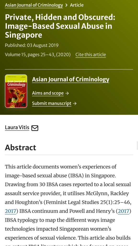 Vitis, Laura. 2020b. Private, Hidden and Obscured: Image-Based Sexual Abuse in Singapore. Asian Journal of Criminology.