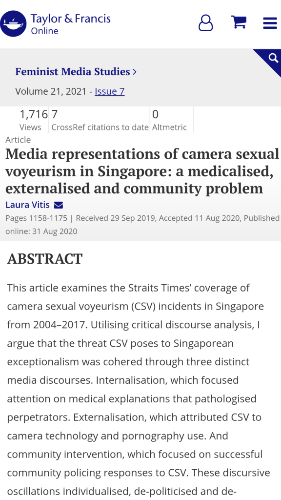 Vitis, Laura. 2020a. Media representations of camera sexual voyeurism in Singapore: A medicalised, externalised and community problem. Feminist Media Studies.